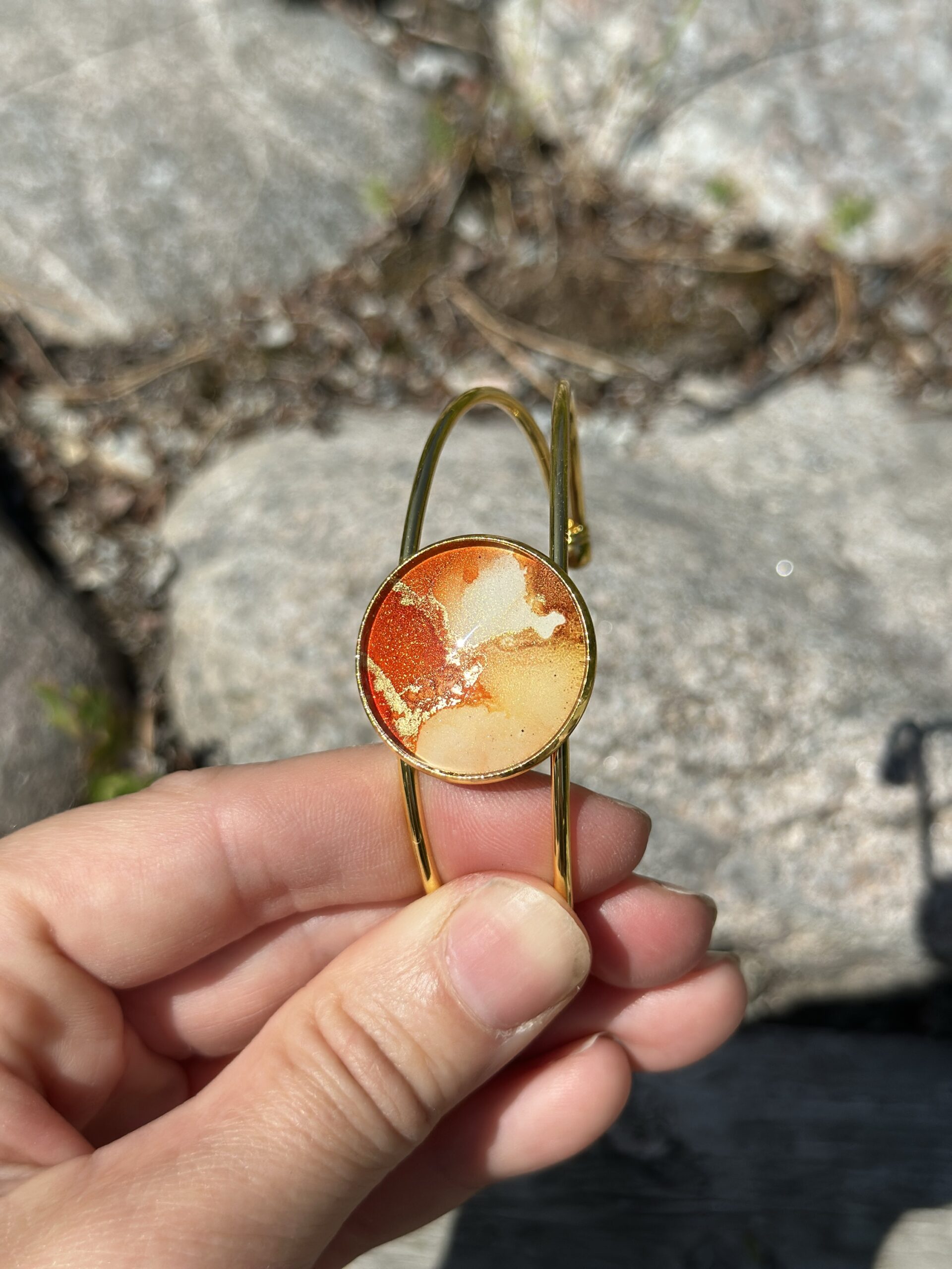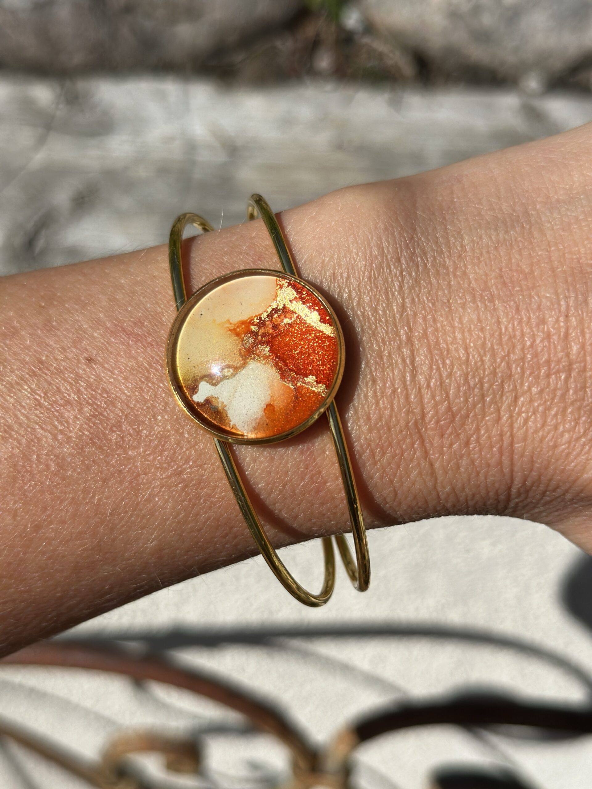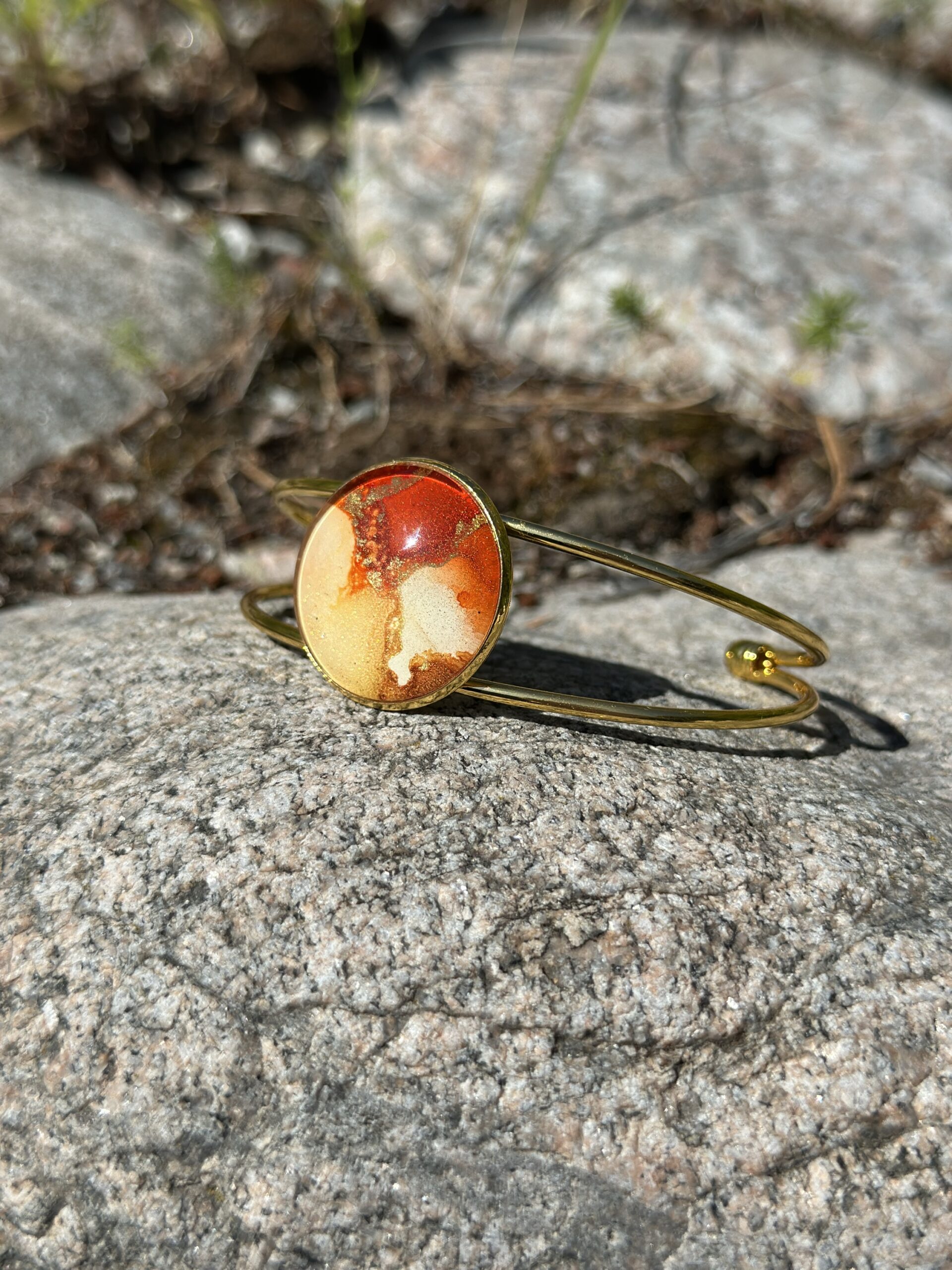 Armband i rostfritt stål, guldfärgad, med 25 mm infattning. Handmålad i alcohol ink vilket gör varje smycke får sin unika färg och mönster.