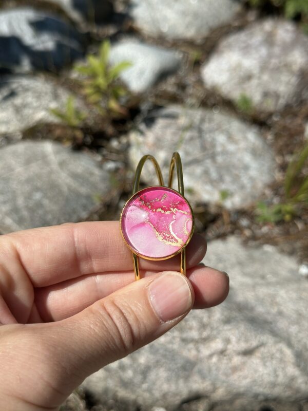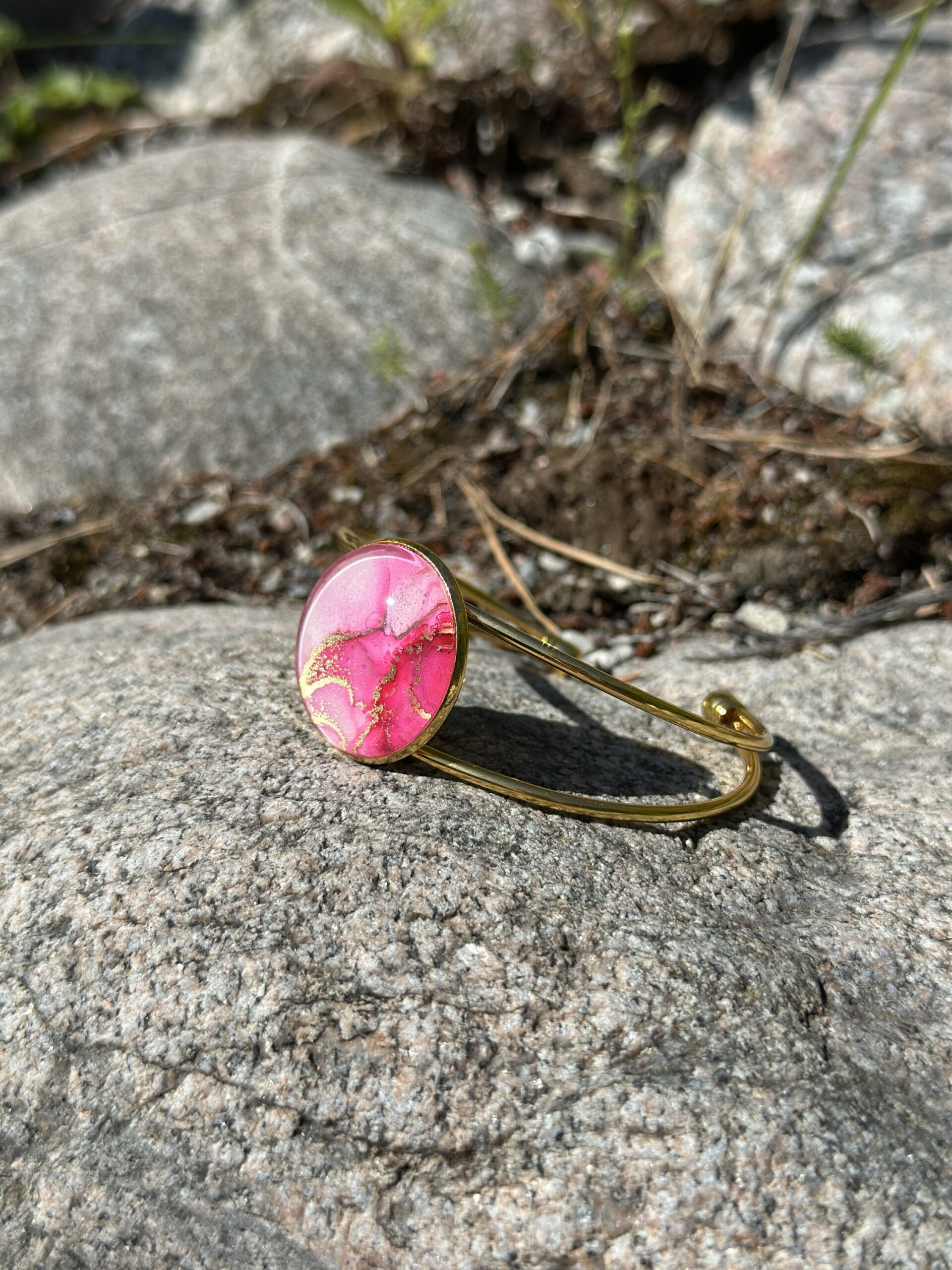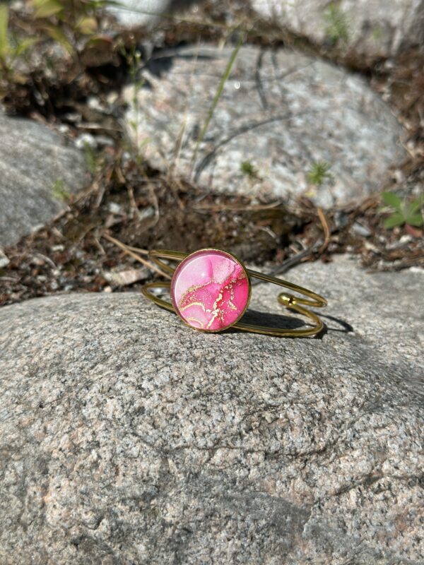 Armband i rostfritt stål, guldfärgad, med 25 mm infattning. Handmålad i alcohol ink vilket gör varje smycke får sin unika färg och mönster.