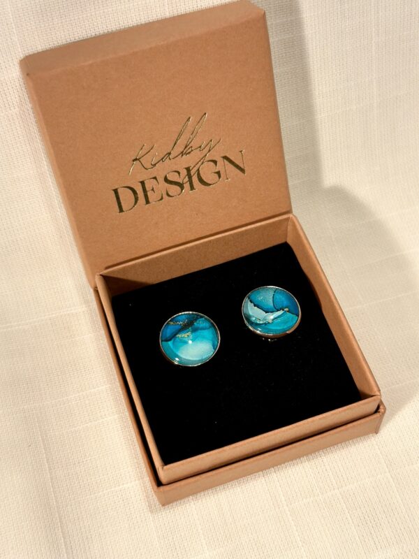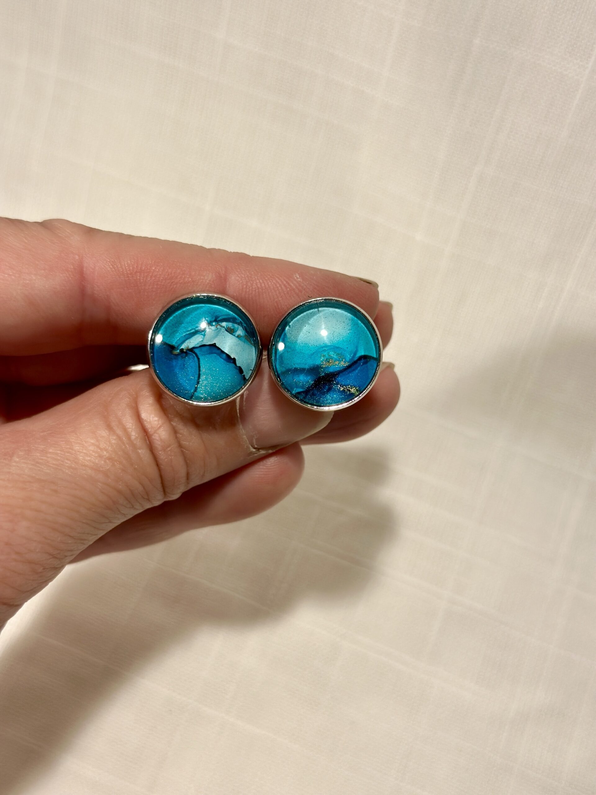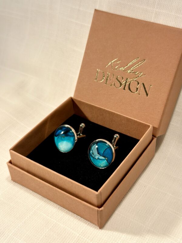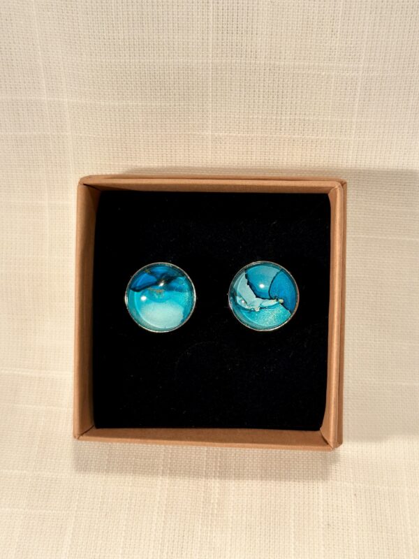 Handgjorda manschettknappar, silverfärgade (16mm). Målade med alcohol ink vilket gör varje knapp unik. Bas i rostfritt stål.