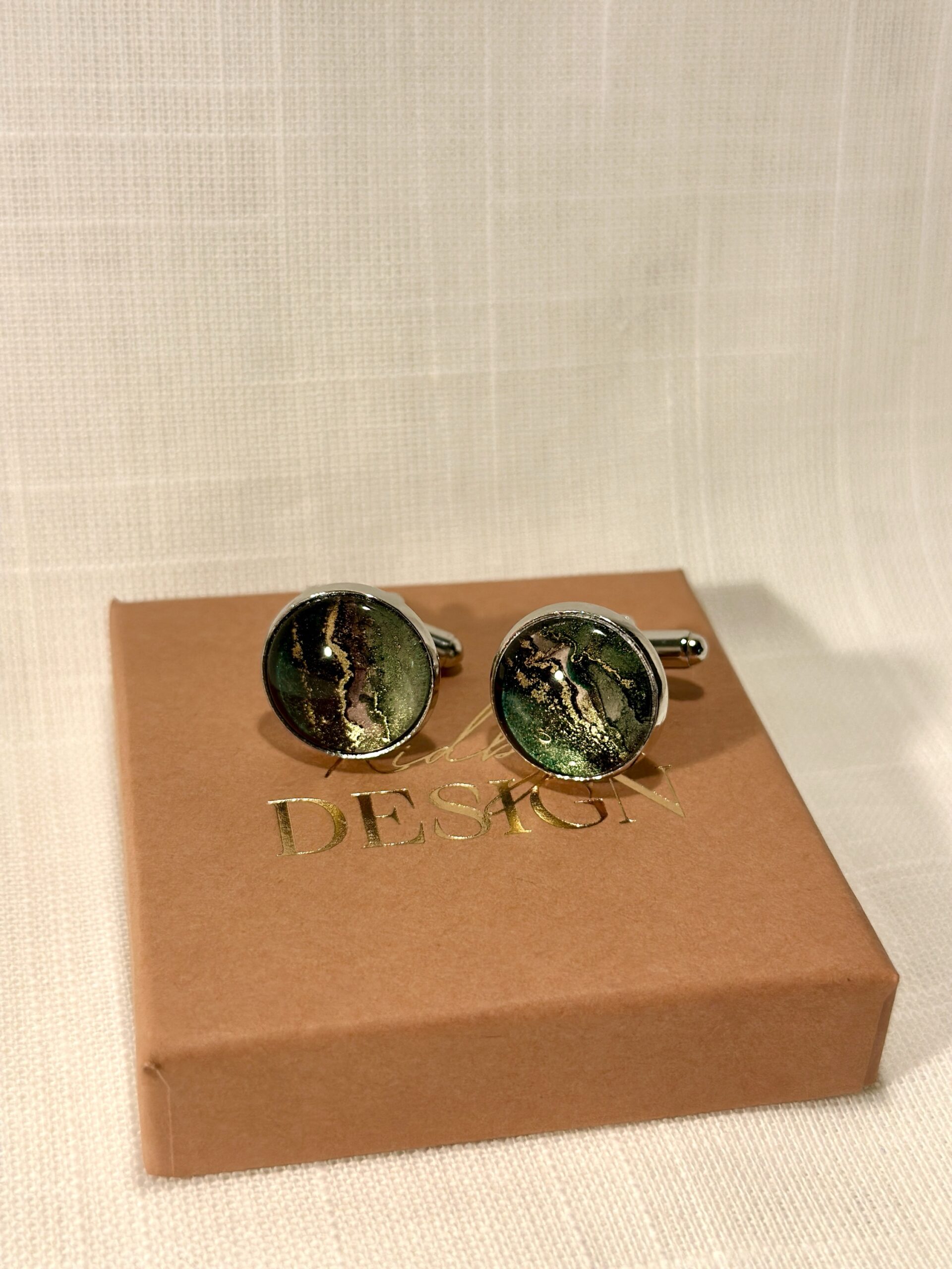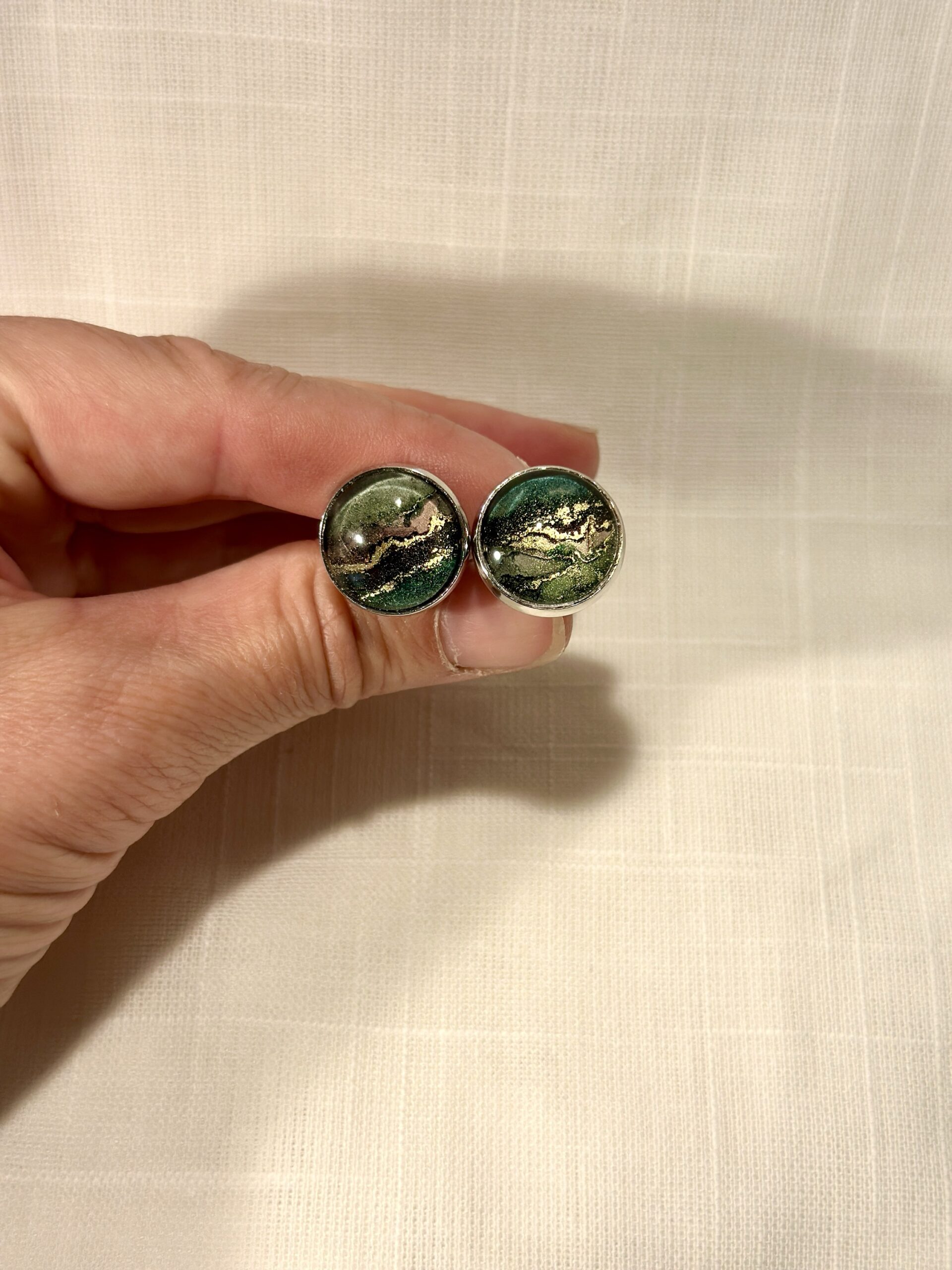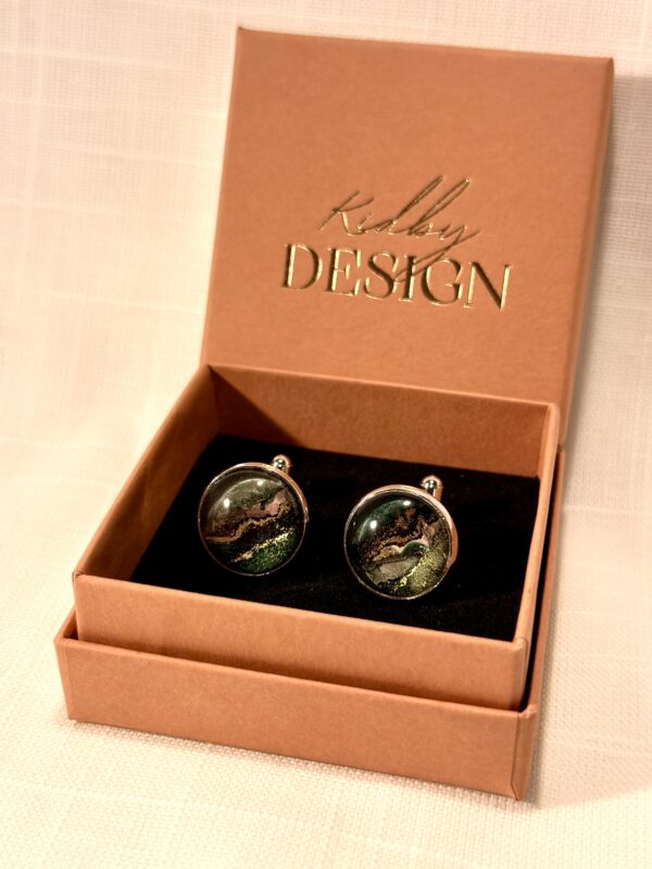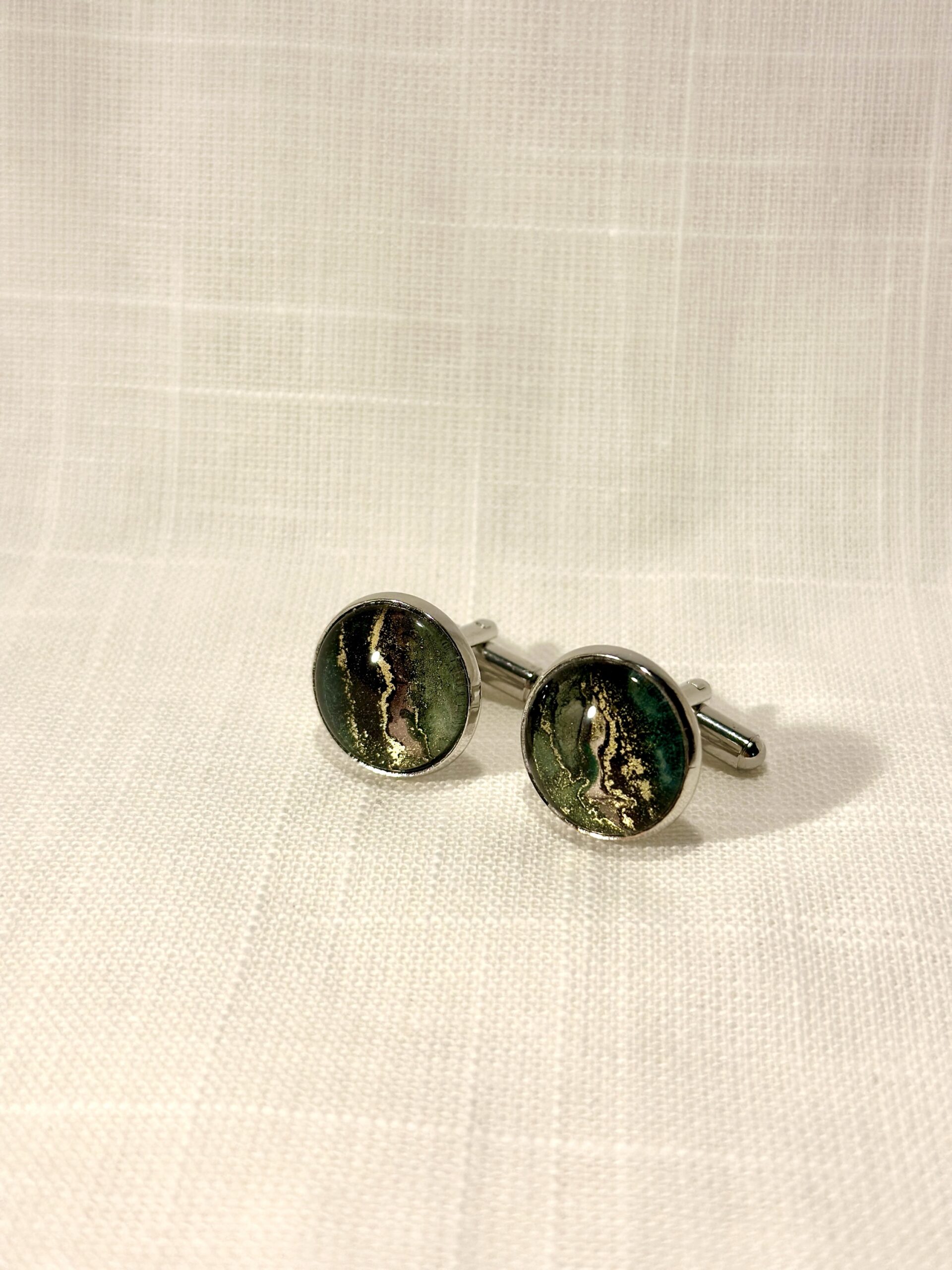 Handgjorda manschettknappar, silverfärgade (16mm). Målade med alcohol ink vilket gör varje knapp unik. Bas i rostfritt stål.