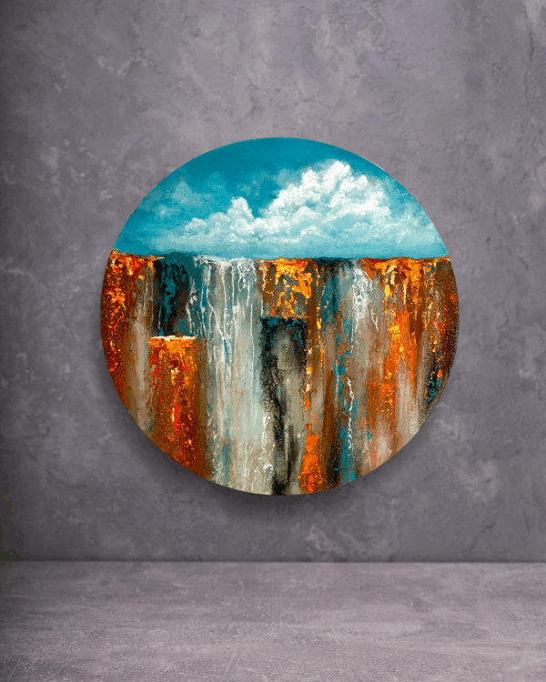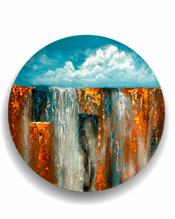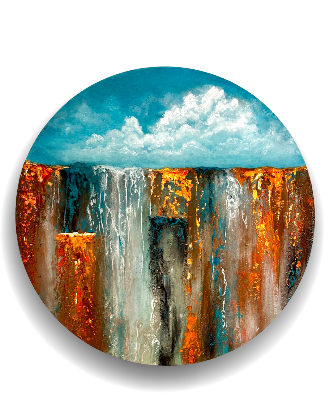 Texture, acrylics and gold leafs on wooden art panel, 45 cm.